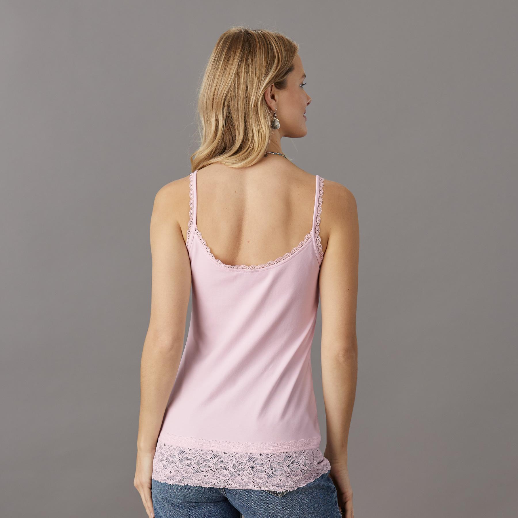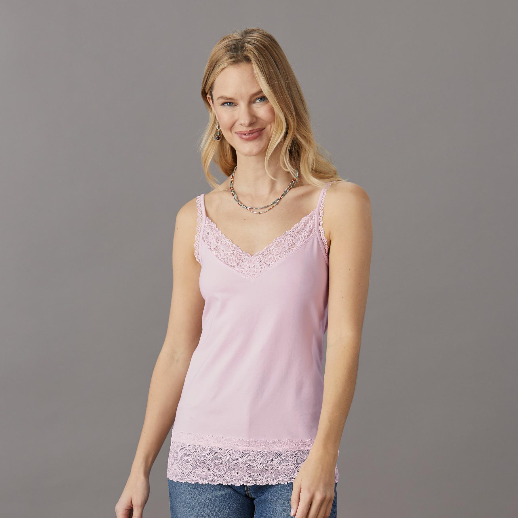 An everyday essential with the most beautiful lace at V-neck. shoulder straps and hem. Stretchy and soft. it makes the perfect underlayer. Supima cotton/spandex. Machine wash. Imported. Exclusive. Sizes XS (0-2). S (4-6). M (8-10). L (12-14). XL (16-18). XXL (20-22). Approx. 26l.