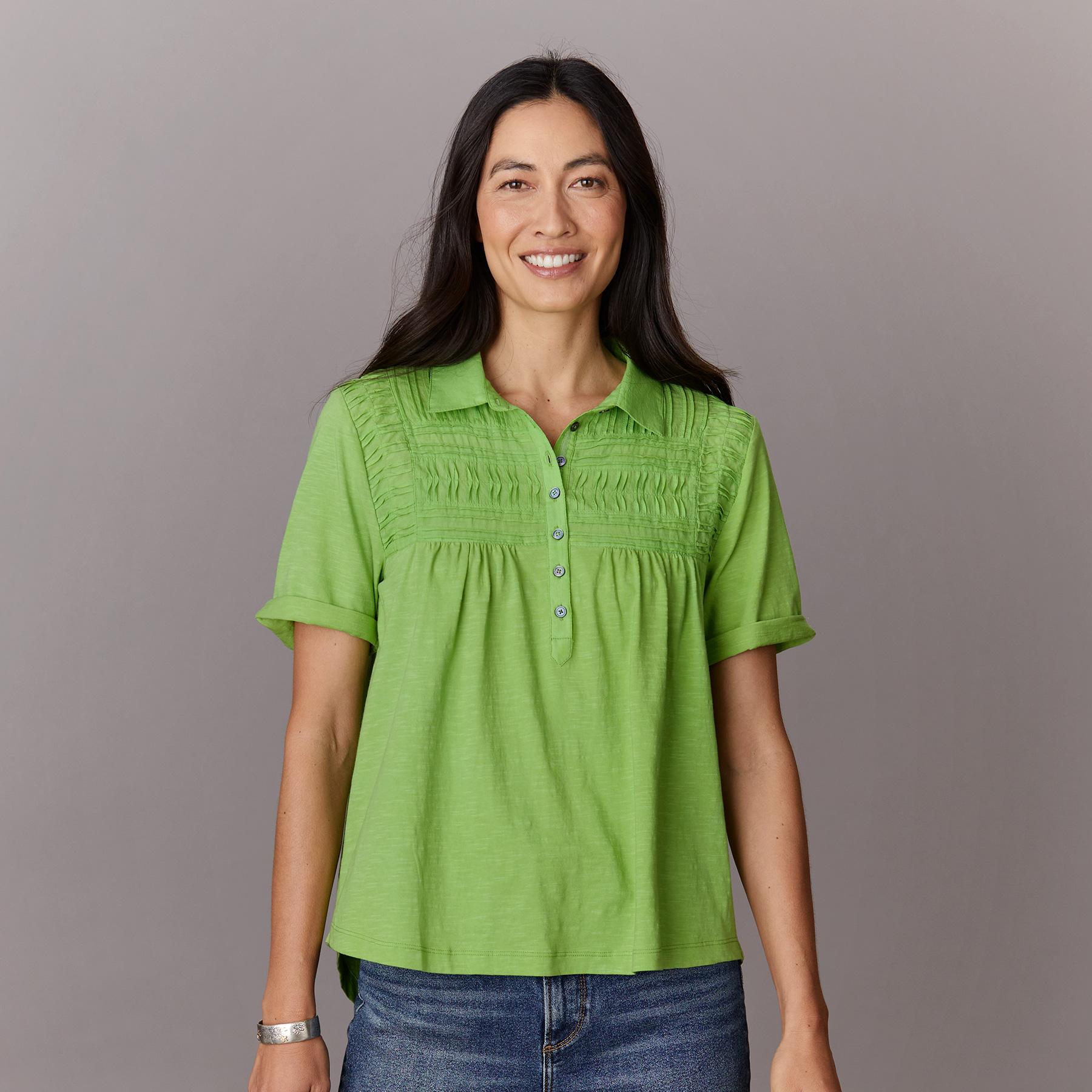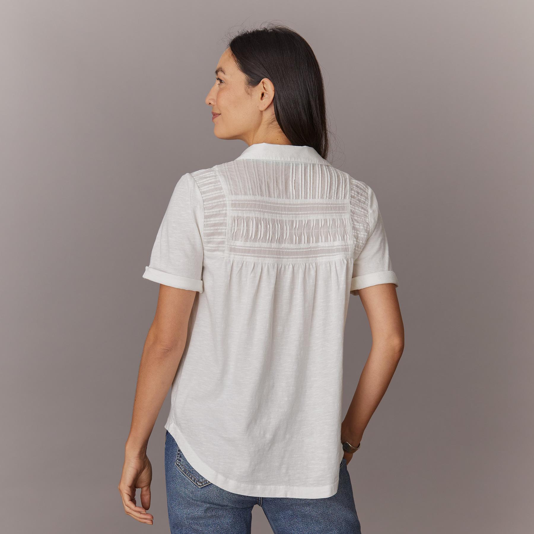 Our mixed henley top is an easy essential for your everyday style with so many pretty details. Contrasting pintucks at the front yoke. rolled sleeves and contrast bar tacks at the side seams. Natural shell buttons. Cotton. Machine wash. Imported. Exclusive. Sizes XXS (00). XS (0-2). S (4-6). M (8-10). L (12-14). XL (16-18). Approx. 23l.