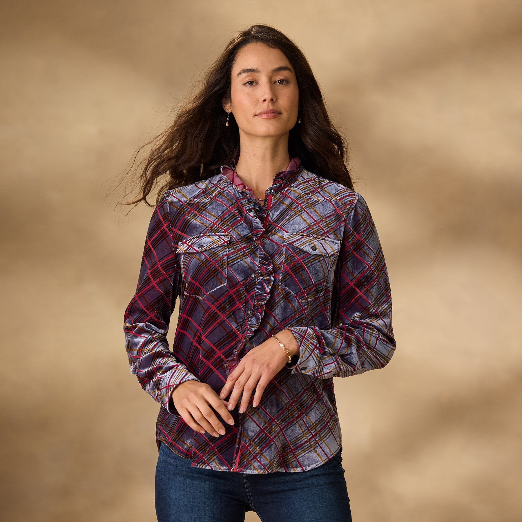 A Sundance favorite now in printed burnout velvet. this Western inspired. soft plaid shirt is beautiful with ruffles at the neckline for a feminine twist. Two patch pockets. snap closure and bandana print detail inside. Viscose/silk. Dry clean. Imported. Exclusive. Sizes XS (0–2). S (4–6). M (8–10). L (12–14). XL (16–18). XXL (20–22). Approx. 26l.