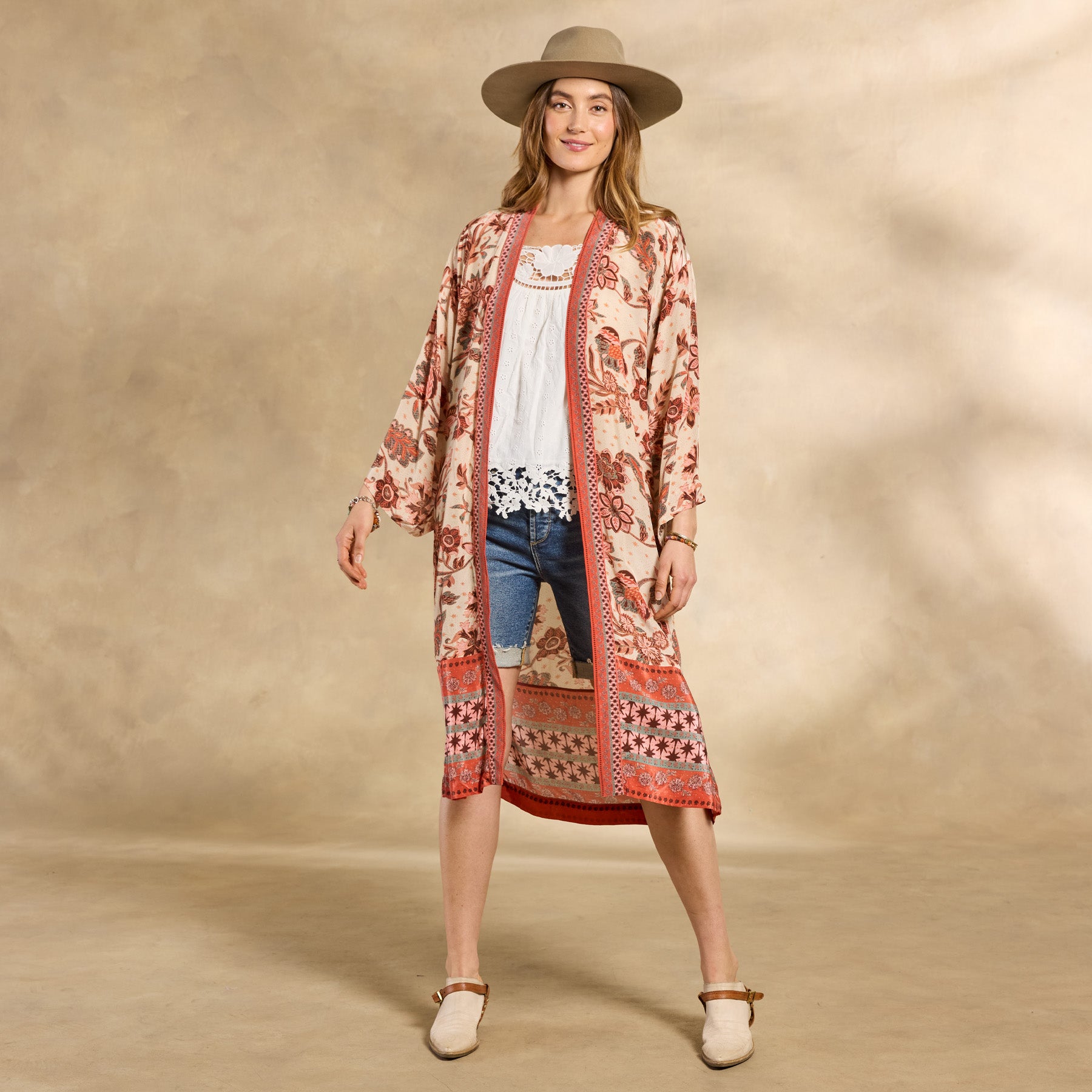 From morning coffee on the patio to après-beach time and beyond. our easy. open-front kimono elevates your every day. With an elegant drape that will make you feel beautiful. charming border print and side-seam pockets. Viscose. Machine wash. Exclusive. Sizes XS (0–2). S (4–6). M (8–10). L (12–14). XL (16–18). XXL (20–22). Approx. 43.5l.