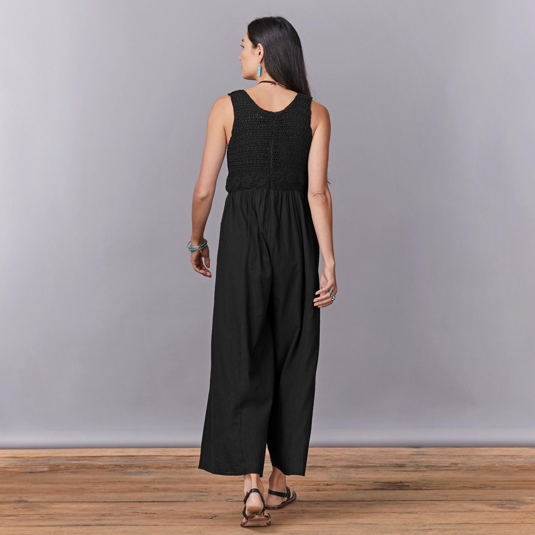 This light and airy. wide-leg jumpsuit features a sleeveless. crocheted bodice; zipper back and side pockets for a perfectly effortless. fair-weather outfit. Cotton. Machine wash. Imported. Exclusive. Sizes XS (0-2). S (4-6). M (8-10). L (12-14). XL (16-18). Front approx. 14-1/8l.