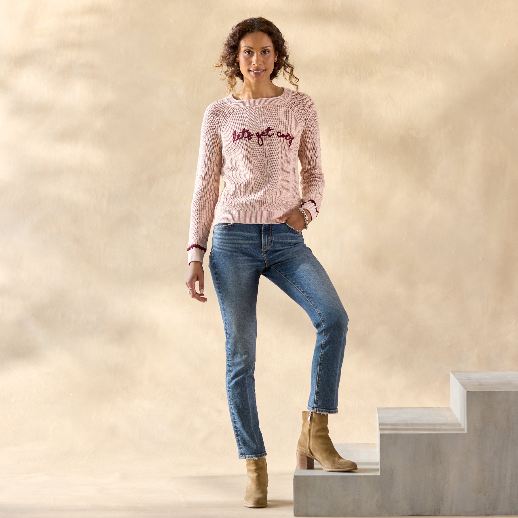 Our fabulously festive rib stitch sweater celebrates the winter season in textural beauty. with acid-washed color. hand-crocheted cuff details. embroidered sentiment. rib trim and crewneck. Simple and sassy. Combed cotton/nylon. Hand wash. Imported. Exclusive. Sizes XS (0–2). S (4–6). M (8–10). L (12–14). XL (16–18). XXL (20–22). Approx. 22.5l.